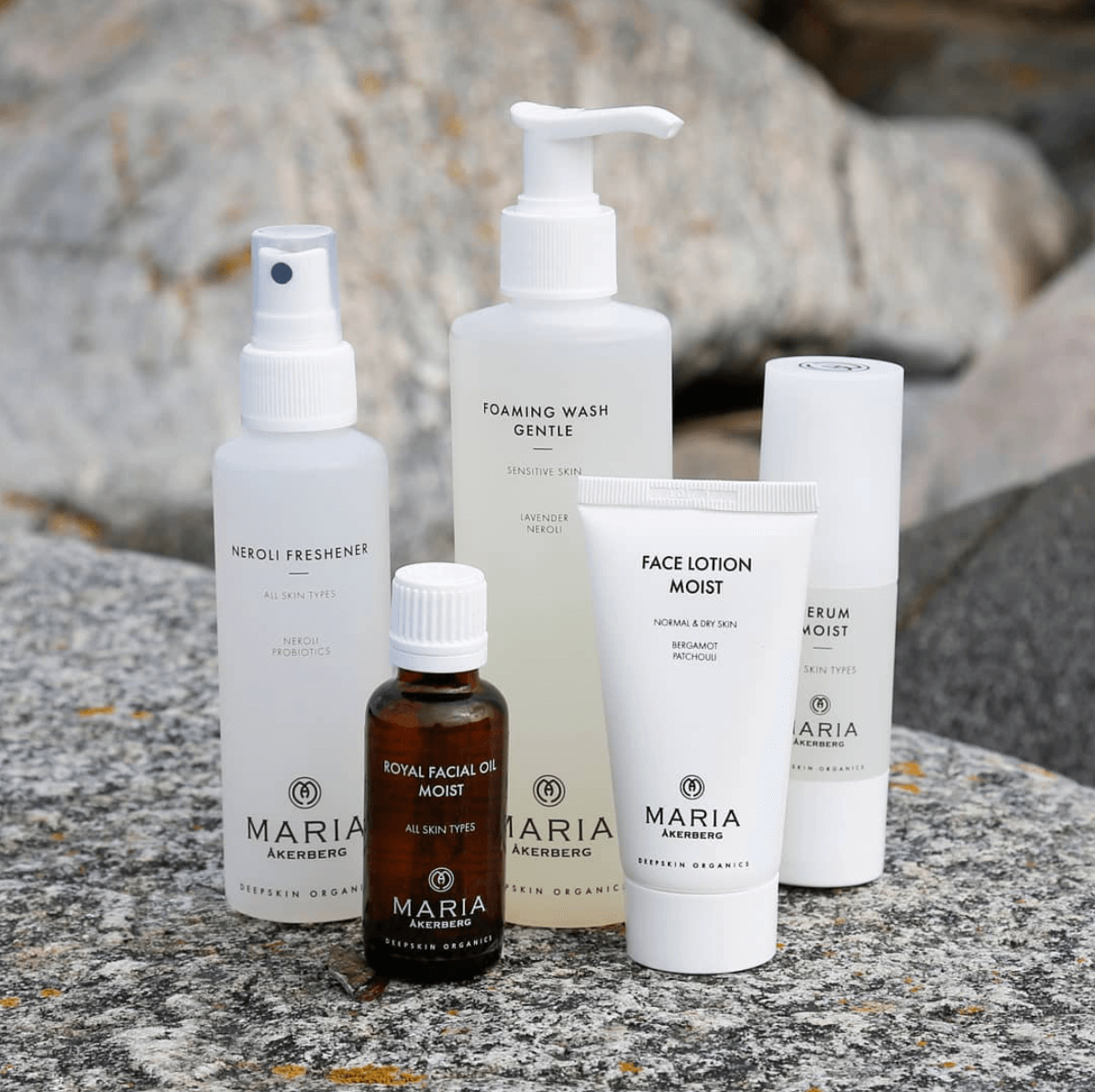 Maria Åkerberg bygger på filosofin Deepskin Organics, där naturliga, växtbaserade och ekologiska ingredienser, som kallpressade oljor, örtextrakt och eteriska oljor, är i fokus för att vårda, återfukta och stärka hudens naturliga skyddsbarriär utan syntetiska tillsatser.